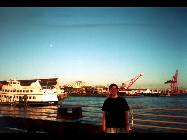Me on a pier in the sound. That's the King Dome left of center. The inspiration for this shot was that you could see Mt. Rainier. For some reason it didn't show up in the photograph. (Vampire?)